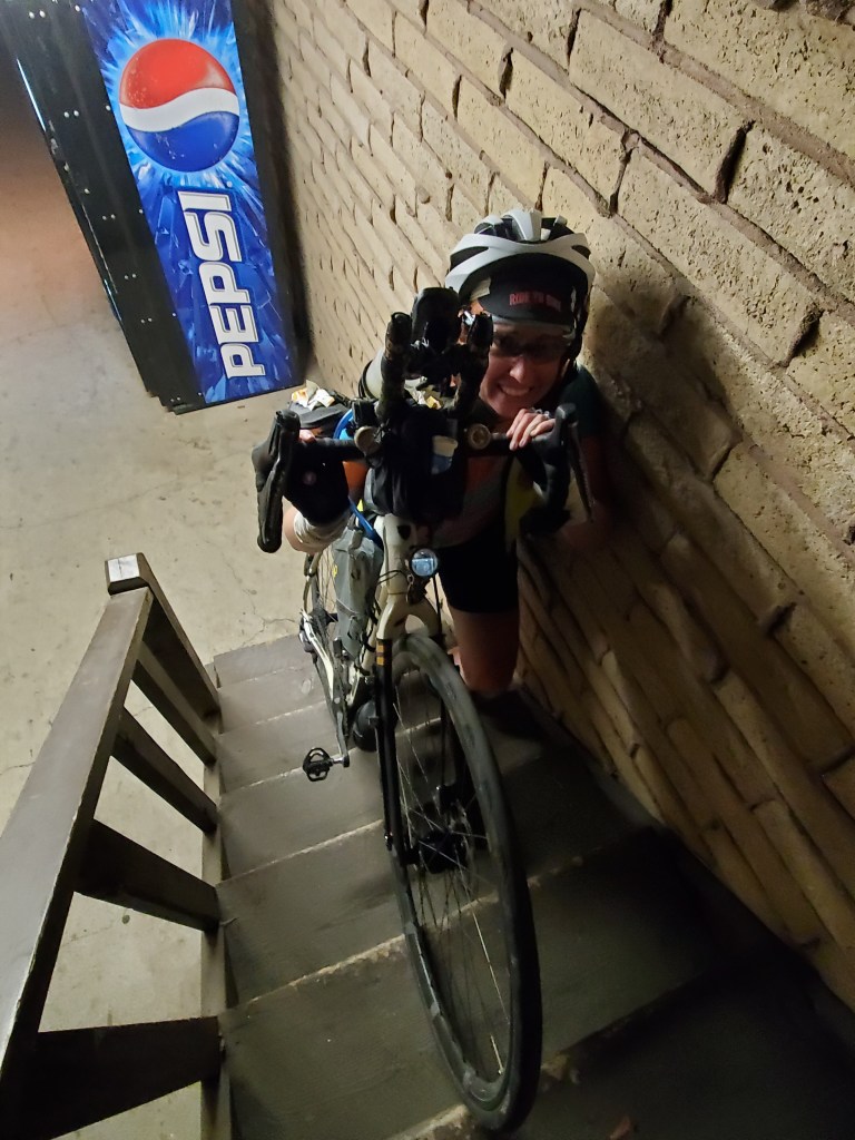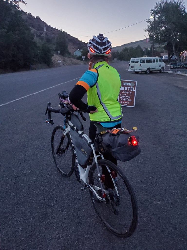 I pushed harder and harder and harder and harder to try and catch him, and when I finally did I gave him quite the earful. I just wanted to be at the motel SO badly so that we could get to sleep early and have a big day the next day. I drafted off him the rest of the way to Baker City, in part because I had completely killed my legs trying to reach him in the first place. The last 4 miles into town felt like they lasted an eternity. We rode through farmland and got hit with a snowstorm of fuzzy cotton coming off the local plants. Finally, the road carved through a few rocky hills and we spotted the lights of the city ahead. The last hint of daylight faded away as we pulled up to our motel at 9:15pm. We’d be staying on the 2nd floor, so we clumsily pulled our bikes up the stairs, laughing about our shaky legs. We had made it another 150 miles that day, and now that we were off our bikes the world felt okay again.