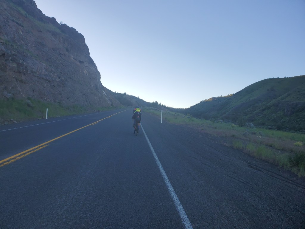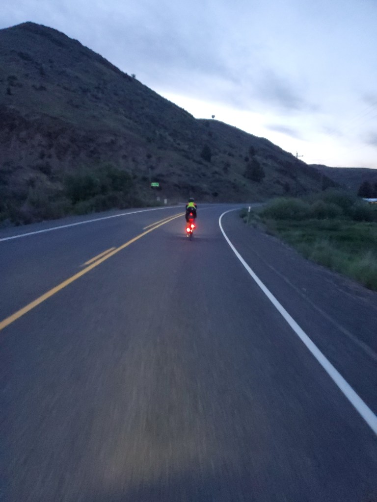 l did well on the 2nd climb and the first half of climb #3, and I was feeling a bit cocky about it. Neither of us had experienced any knee issues since the very beginning of the day, and we chalked it up to climbing a pass first thing in the morning on cold legs. Once again, I had visions of Yorktown in my head. We weren’t the strongest cyclists out there, but we had somehow managed to prepare our bodies well for this adventure. Then all of a sudden about halfway up the last pass, I was just done. I was tired of climbing, I suddenly felt really achy all over, and I tried to find my tylenol but it must have fallen out of my pocket at some point. We finally reached the top at 7 or 7:30pm, which means we had spent 5 or 6 hours on all these climbs. In a complete reversal for the day, I was now officially a whiny jerk. Chris was climbing fast and he told me he still felt totally fresh, which annoyed me. Nonetheless, we only had about 30 miles to ride to get to Baker City, and the whole thing would be downhill. Chris called for a motel in Baker City, and I checked Trackleaders. Kevin and Rolf appeared to be riding together, and they were only 10 or so miles behind us.