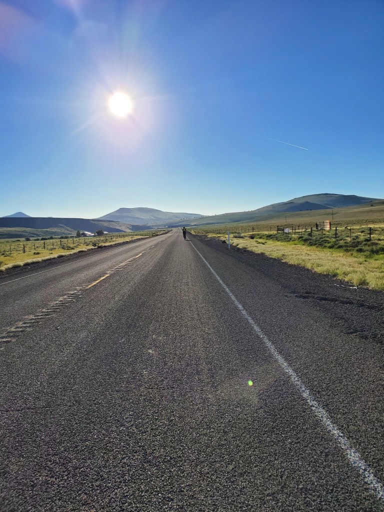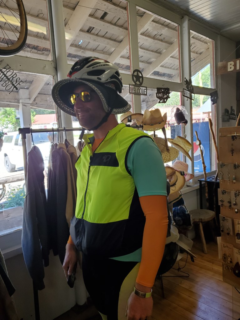 We saw Kevin, Rolf, Daniel, and Brad stopped for a sit down breakfast, but we chose to hit the mercantile across the street. We had been spending so much time sleeping, that we knew our best strategy was to keep a move on during the day. Notably, we would have to face three significant climbs in a row today, and we knew we wanted to make it to Baker City before dark. I picked up cosmic brownies [Chris: Not THAT kind], a mint crunch hershey bar, turkey lunchmeat, fruit, and a zero calorie gatorade. We talked to Kevin for a while when he stopped by the store to find a big floppy hat to keep out the sun. He sounded like he was in better spirits than the day before – claiming he was giving up on the ‘racing’ part of the race in order to better enjoy the journey. I overshared about my saddle sores, because what better way is there to make friends?!