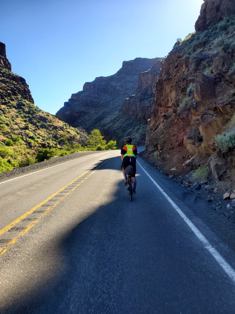 The descent afterwards was incredibly beautiful. 26.2 miles (a full marathon!!) of downhill through a desert canyon led us into Dayville with almost zero cars and barely a need to pedal. It was pretty cold in the shade of the hills, but I refused to stop to put on gloves or a jacket even as my fingers grew stiff with the chill. The previous day we had noticed a fellow rider off course in this area, and today we giggled as we realized they must have gotten stuck on the gravel trail below the highway.