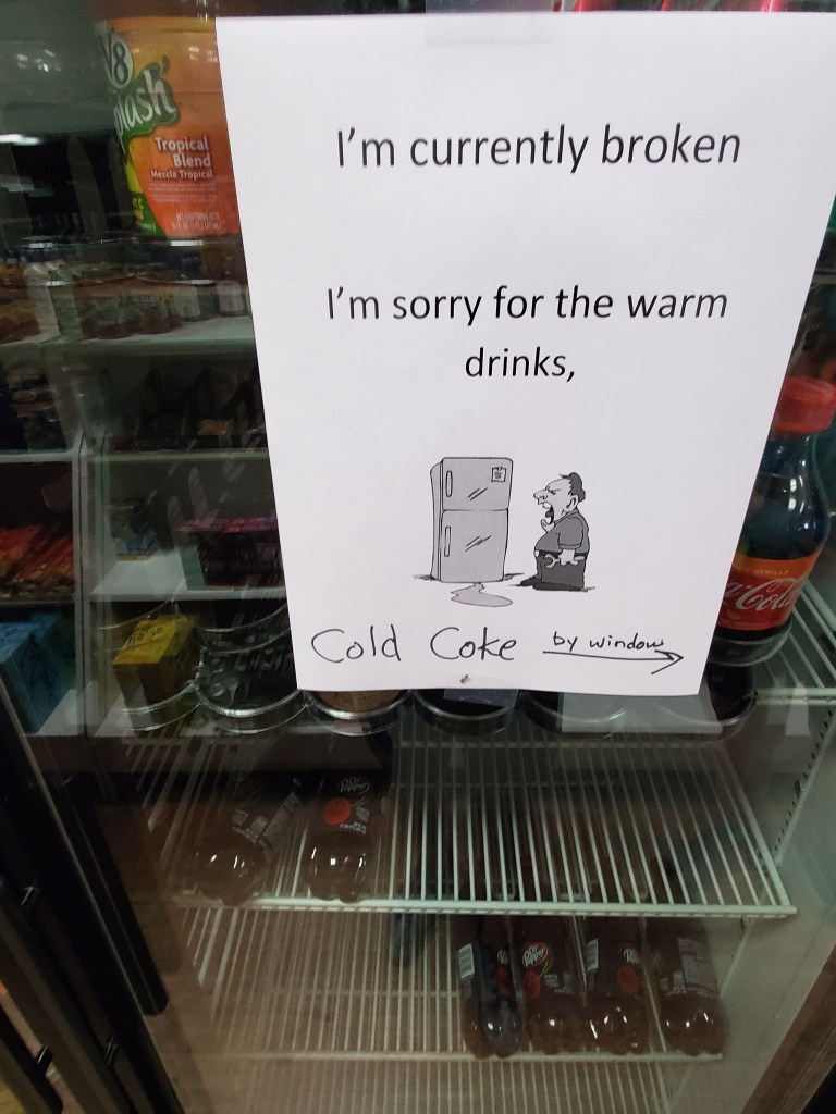 And they weren’t kidding about the “warm” drinks; the cooler was so broken that it was actually HEATING the drinks.