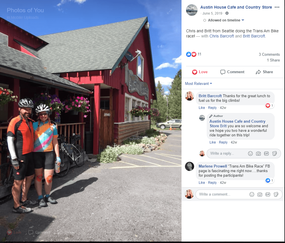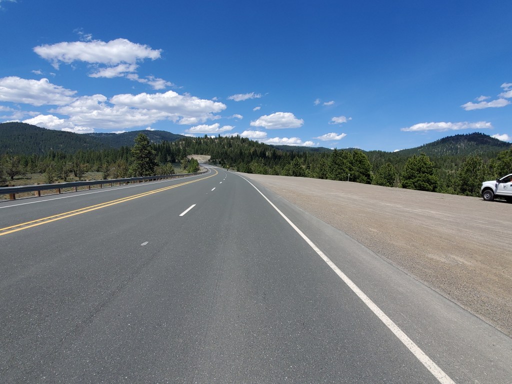 With temperatures in the upper 80’s and the blistering midday sun beating down on us, we pulled over briefly to put on our sunsleeves. After that, I allowed Chris to ride on ahead of me as I paced myself to avoid overheating up the climb. Dixie is pretty exposed, so the best bet was to do the whole thing in one burst to get it over with. I saw Chris catch up with a touring cyclist up ahead, and then about halfway up the climb they found a scenic view with a bit of shade [Chris: A comically oversized covered wagon!] to pull off and rest while they waited for me. It turns out the cyclist was going to be on the road for at least a few months, traveling from San Francisco and headed towards Boise. In the present day, I can’t for the life of me remember what his final destination was! After I caught up, we all continued on together. Just over the top of Dixie, we came upon Austin House. Chris ordered a burger, and he shared a cherry shake with me. We filled all our bottles and water bladders, and stuffed some low cal Gatorade into our jersey pockets. I was drinking a lot today, and I didn’t think we’d be able to refill again for about 6 hours. Before we left, we talked with the touring cyclist one last time. He looked pretty knackered, and said he had wiped himself out trying to keep up with Chris on the climb. He looked like a really strong cyclist, but he had over 100 pounds of gear to haul up these mountains. I reassured him that it was okay, I was also destroyed from trying to keep up with Chris.